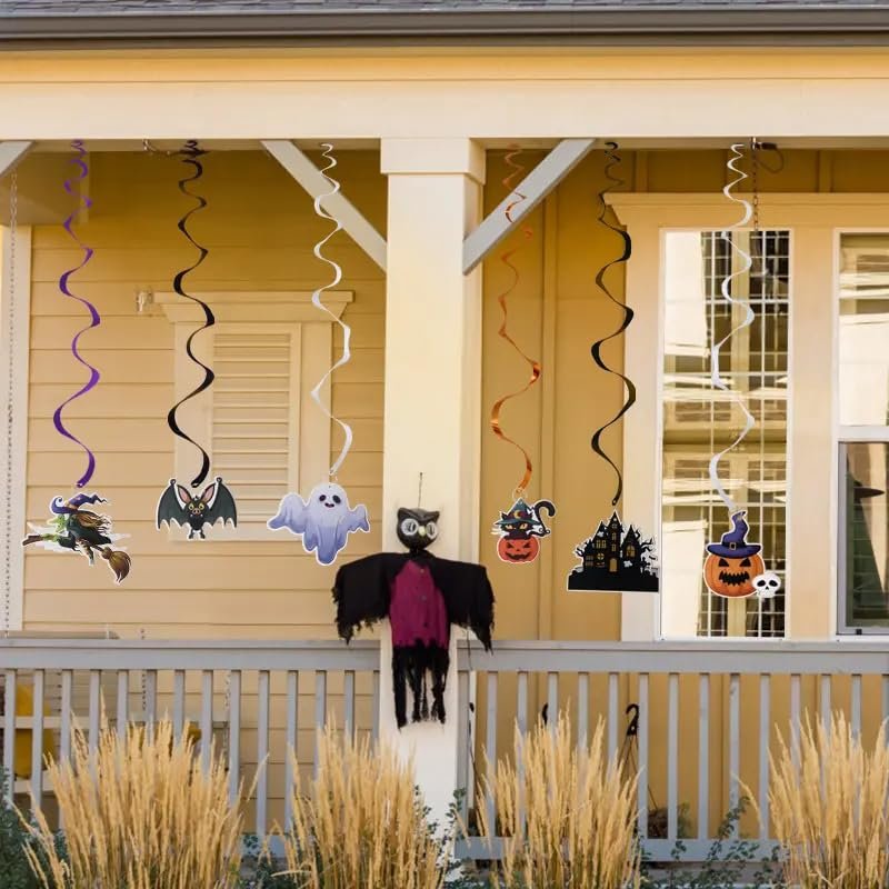 - Spooky Halloween swirl decorations with 6 spiral and 6 pendant designs featuring pumpkins, bats, black cats, ghosts, witches, and haunted houses.