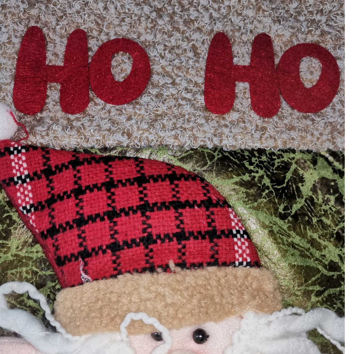 - 🎄 Cute Plush Santa Design: Features a smiling Santa with a fluffy beard, red suit, checkered hat, wooden-style belt buckle & “Ho Ho” stitched text.