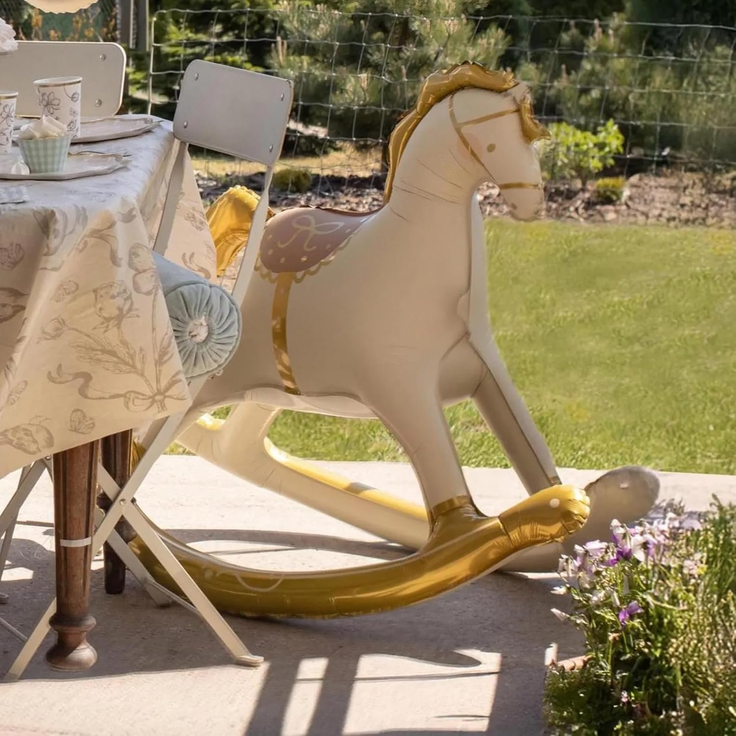 This magnificent gold and cream rocking horse foil balloon brings a touch of vintage charm and whimsy to your celebration. Measuring an impressive 109 x 107 centimetres, this large air-inflatable balloon makes a stunning focal point for baby showers, birthday parties, and children’s celebrations. The elegant design features a classic rocking horse silhouette in soft cream tones, beautifully accented with golden details including the mane, tail, saddle, and curved rockers. The decorative saddle with its bow embellishment adds an extra touch of sophistication to this delightful party decoration. Crafted from durable foil material, this balloon holds its shape wonderfully and creates a memorable backdrop for photographs and party displays. Whether you’re celebrating a new arrival, a child’s birthday, or creating a carousel-themed event, this charming rocking horse balloon captures the nostalgic magic of childhood. The generous size ensures it commands attention whilst the refined colour palette complements a variety of party themes and colour schemes. Simply inflate with air to transform your venue into a festive wonderland that guests of all ages will adore.