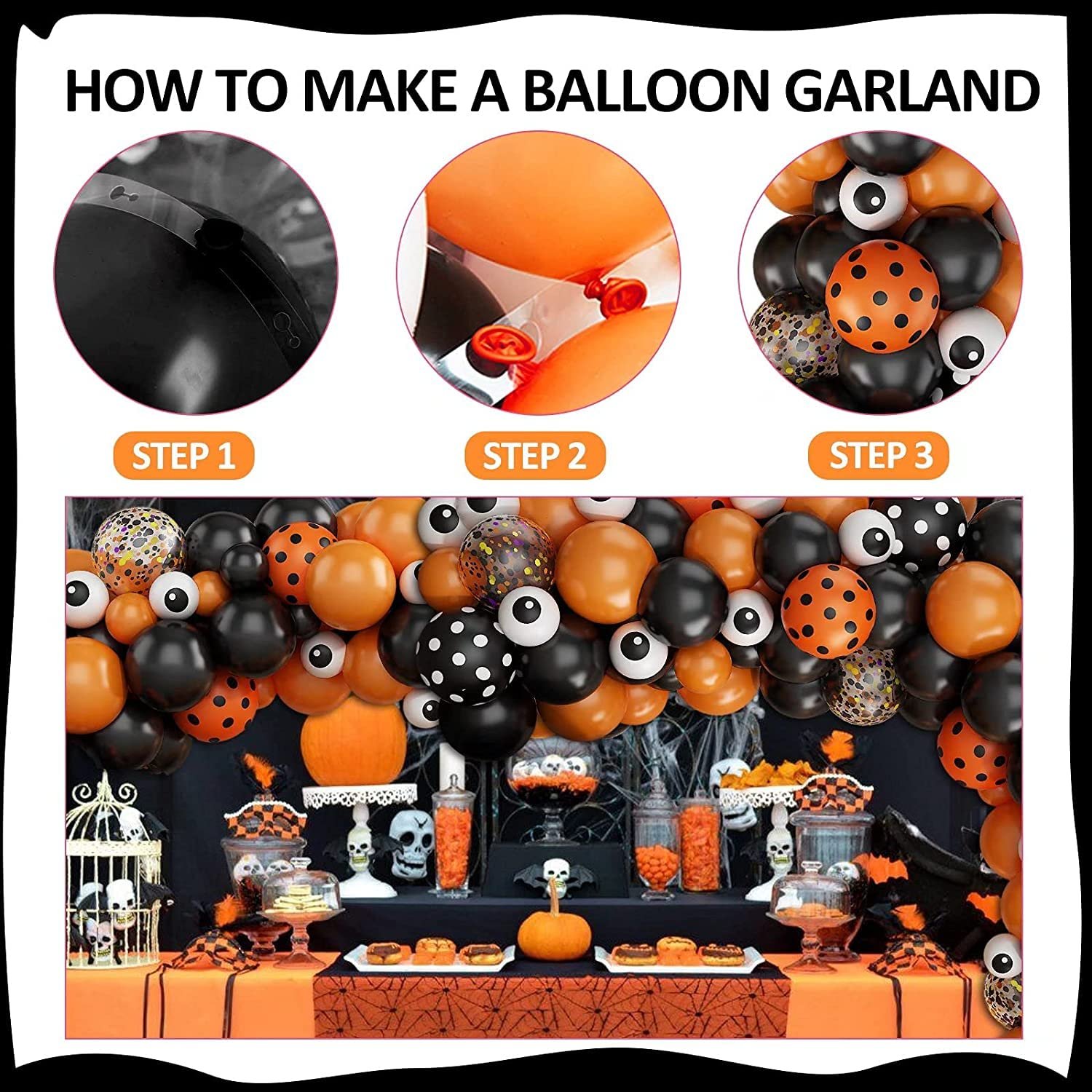 - HALLOWEEN DECORATION SET: The Halloween balloon garland kit includes 35pcs 12” latex balloons (25*orange, 25*black, 8*black polka-dot, 8*orange polka-dot, 5*white eyeballs), 1pc straw,100pcs glue dots