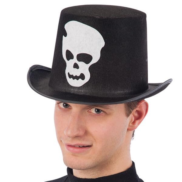 - Black top hat with skull. Black fabric top hat with the image of a white skull for adults. Halloween/horror costume accessories.