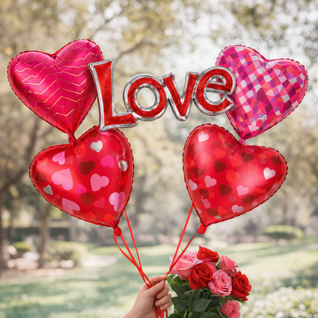 - ✔ Romantic Heart Balloon Set – Includes 4 designer heart-shaped foil balloons in red and pink tones for charming decoration.