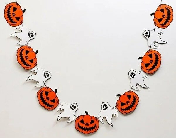 - banner features alternating pumpkin and ghost cutouts with expressive faces – perfect mix of creepy and cute decor for kids and adults!
