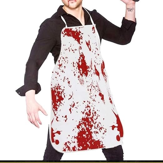 - BLOODY APRON – Ideal for Trick or Treat Great. Red Blood spatter novelty halloween butcher horror apron, full of horror, joke and funny. Lifelike shape and realistic horror looking. As a scary prop for party, it can really help to create special and memorable moments for you and your friends. Great for Haunted Houses, Graveyard Scenes, Halloween Parties and for Frightening trick-or-treaters