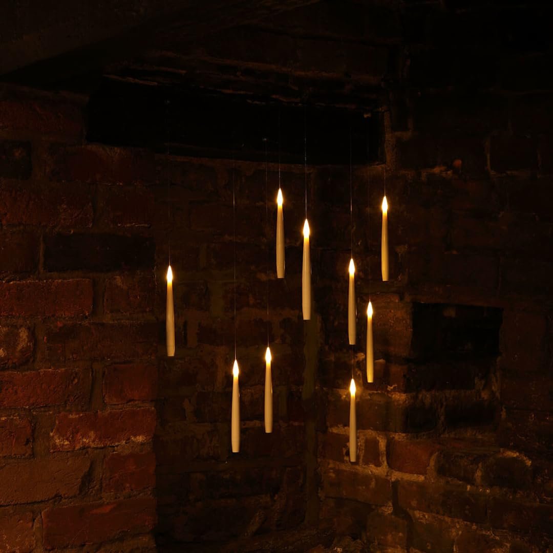 - Halloween Decor floating candle with wand features a warm white flickering flame design that creates a charming atmosphere. 3D realistic to look like a real candle flame flickering. You can hang these candles from the ceiling or chandelier to create a “floating” candle effect for a movie-themed party.