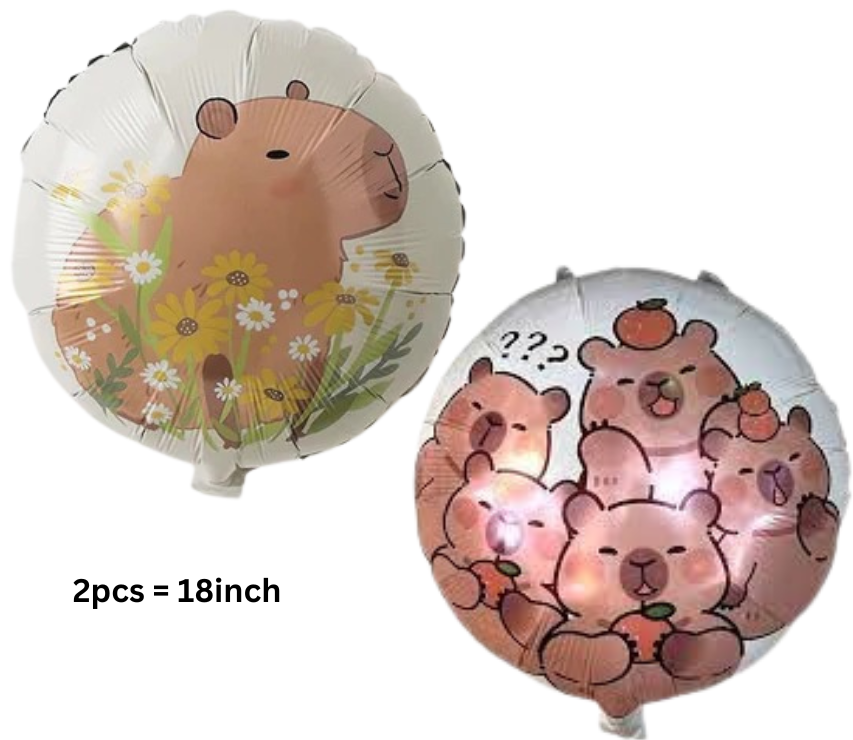 - Package contains: Set of 5 Capybara sitting in Car Foil Balloons: 1pc. Capybara sitting in Car Foil balloon 18*20inch , 2pcs round shaped(circle) balloons with Capybara print= 18inch, 2pcs brown color Star foil balloons = 18 inch