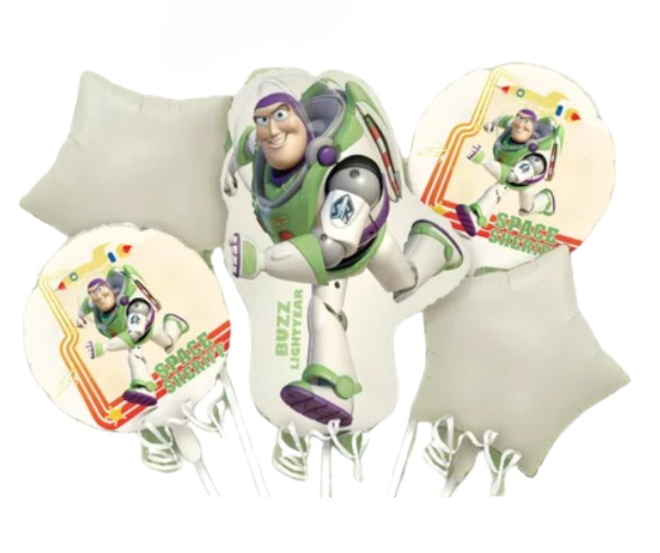 Set of 5 Buzz Lightyear foil balloons: 1 pc. = Buzz Lightyear balloon 17*24inch, 2pcs star balloons 18inch , 2 round or circle shape balloons 18inch with Buzz Lightyear print. You can use it for birthday decoration, space themed party, kids party.
