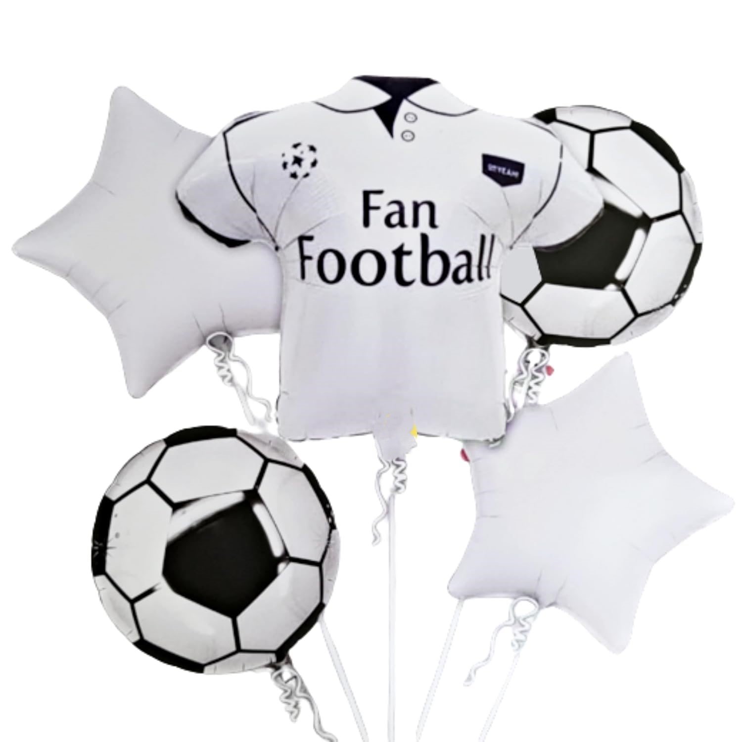 - Package Contains: Set of 5 Soccer jersey and football foil balloons for football fans, 1pc Soccer Team T-shirt/jersey Foil balloon, 2pcs silver star foil balloons and 2pcs round shaped black-white foil balloons.