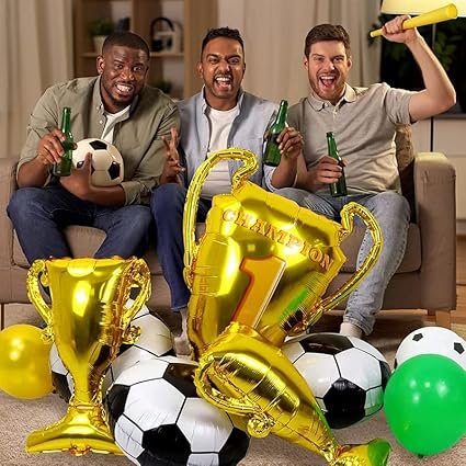 - Package Contains: Set of 6 Champion trophy and football foil balloons for football fans, 1pc golden trophy Foil balloon 23inch, 1pc light green star foil balloon 18inch, 1pc dark green star foil balloon 18inch and 3pcs round football shaped foil balloons.