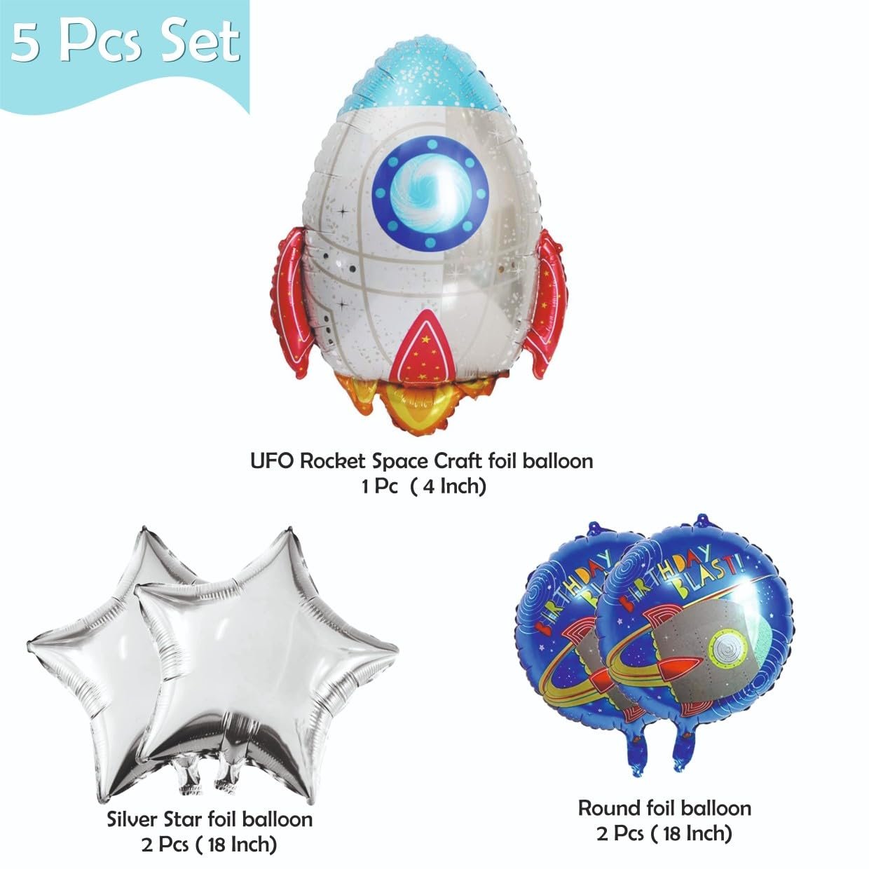 Package Contains: Set of 5 Rocket theme birthday Foil Balloon 1 big size rocket balloon, 2 silver color star balloons and 2 black round shaped balloon with birthday and astronaut print.