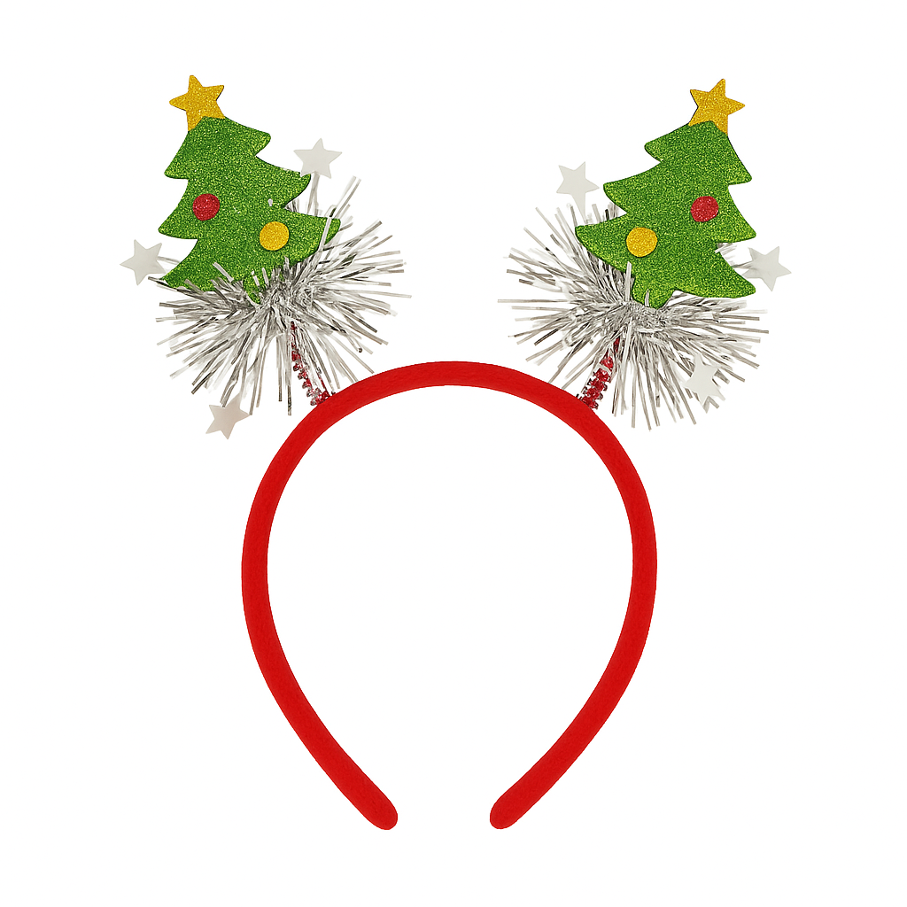 Bring instant Christmas cheer with this Set of 2 Glitter Christmas Tree Tinsel Headbands by MPS MY PARTY SUPPLIERS. Designed with sparkling green Christmas tree toppers, colorful stars, and shiny silver tinsel, these headbands add a bright and festive look to any holiday outfit. Made with a soft velvet-covered band, the headbands ensure a comfortable fit for kids and adults, making them perfect for Christmas parties, school events, family gatherings, festive photoshoots, office celebrations, Santa-themed activities, and holiday dress-up. The bouncy antenna trees and glitter detailing create a fun, eye-catching accessory that completes your Christmas look in seconds.