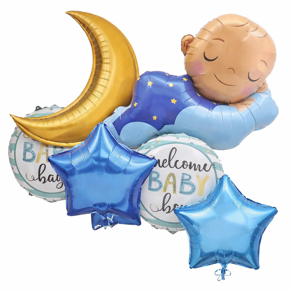 Create a dreamy celebration with this adorable 6-piece baby boy balloon set. Featuring a sleeping baby on the moon, star balloon, and “Welcome Baby Boy” balloons, it’s perfect for baby showers, newborn welcome parties, and nursery décor.